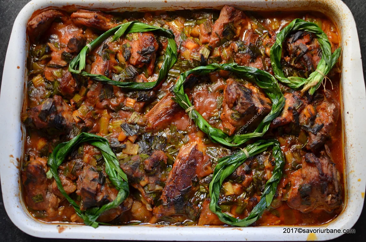 Ingrediente: 1 kg de carne de miel (spinare, coaste, gat etc), 3 legaturi de usturoi verde + 3 legaturi de ceapa verde, sare, piper, 3 linguri ulei, suc de rosii