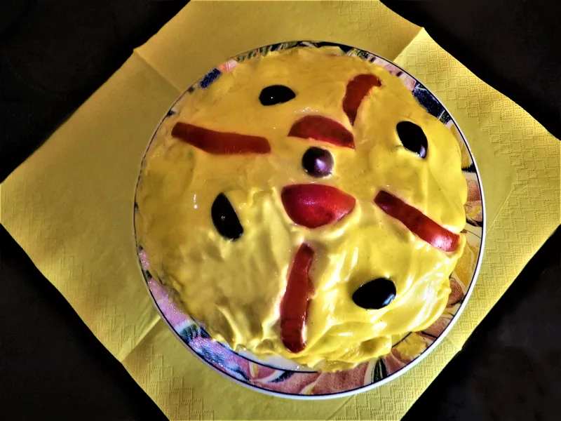 Maioneza se adauga peste amestecul de carne si legume, si se mai pastreaza o lingura pentru ornat.
