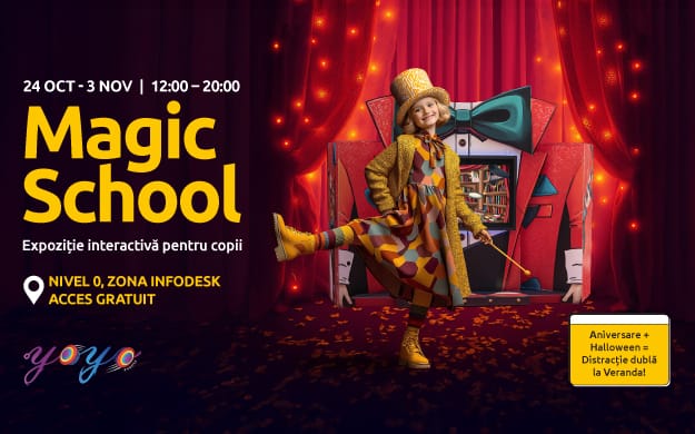 Cu ocazia aniversării a 9 ani de la deschiderea Veranda Mall și a sărbătorii de Halloween, te invităm să descoperi Magic School – o expoziție interactivă unică, cu acces gratuit, gândită special pentru această perioadă festivă.